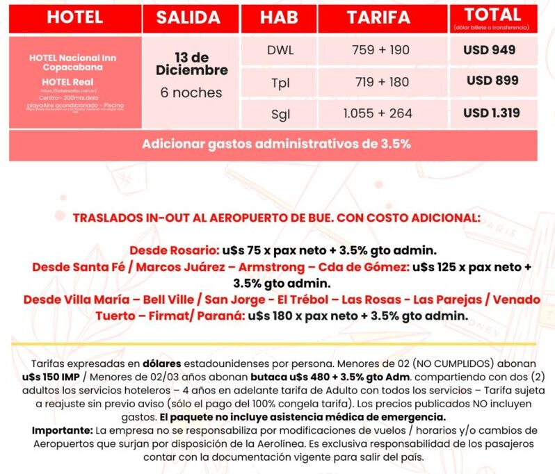 • Aéreo con Cía. Flybondi. MUY IMPORTANTE: Los horarios de los vuelos se confirman 24 / 48 hs. antes de la salidas, sujetos a posibles