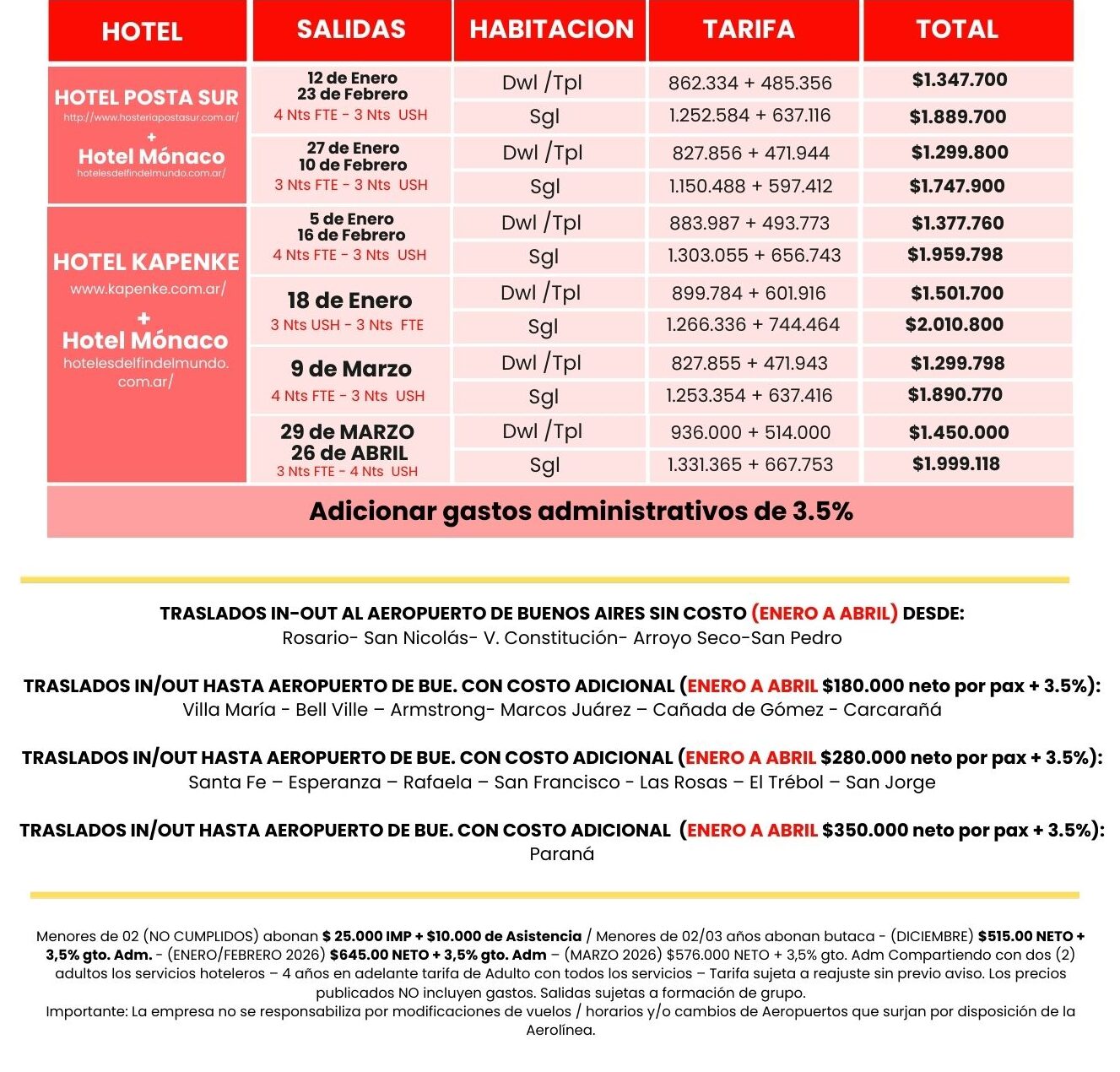 - Traslados privados pre y post aéreo hasta Aeropuerto de Buenos Aires (*consultar ruta)