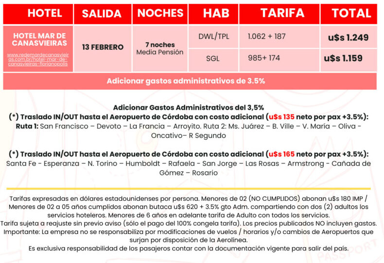 •Aéreo con Cía. Flybondi. MUY IMPORTANTE: Los horarios de los vuelos se confirman 24 / 48 hs. antes de las salidas, sujetos a posibles modificaciones correspondientes pura y exclusivamente por determinación de la Aerolínea, ajenas a nuestra Empresa. Las butacas se asignan aleatoriamente.