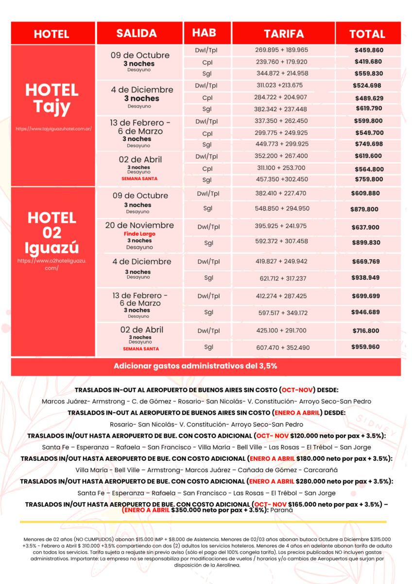 MUY IMPORTANTE: Los horarios de los vuelos se confirman 24 / 48 hs. antes de la salidas, sujetos a posibles modificaciones correspondientes pura y