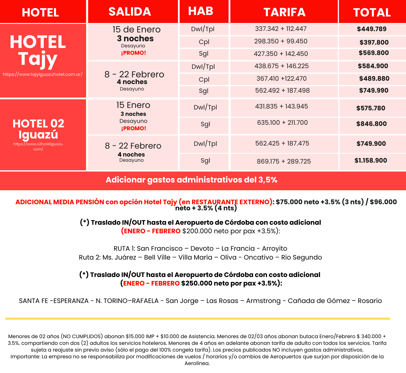 MUY IMPORTANTE: Los horarios de los vuelos se confirman 24 / 48 hs. antes de la salida,