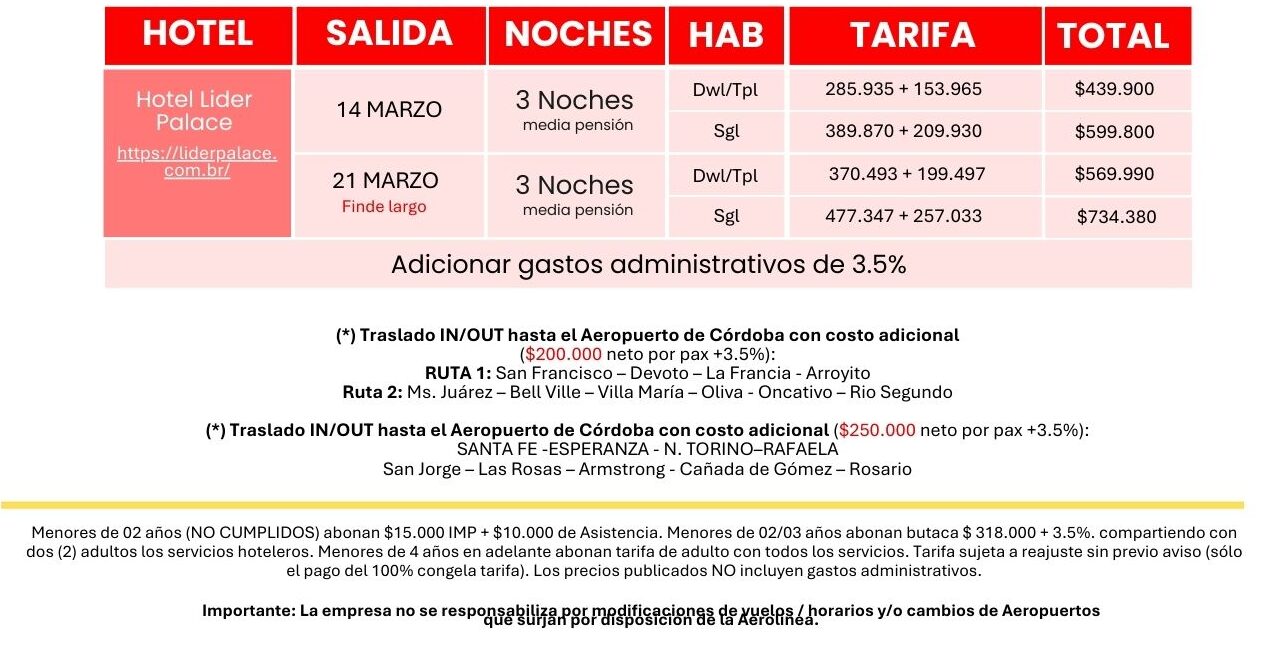 MUY IMPORTANTE: Los horarios de los vuelos se confirman 24 / 48 hs. antes de la salida, sujetos a posibles modificaciones correspondientes pura y exclusivamente por determinación de la Aerolínea, ajenas a nuestra Empresa.