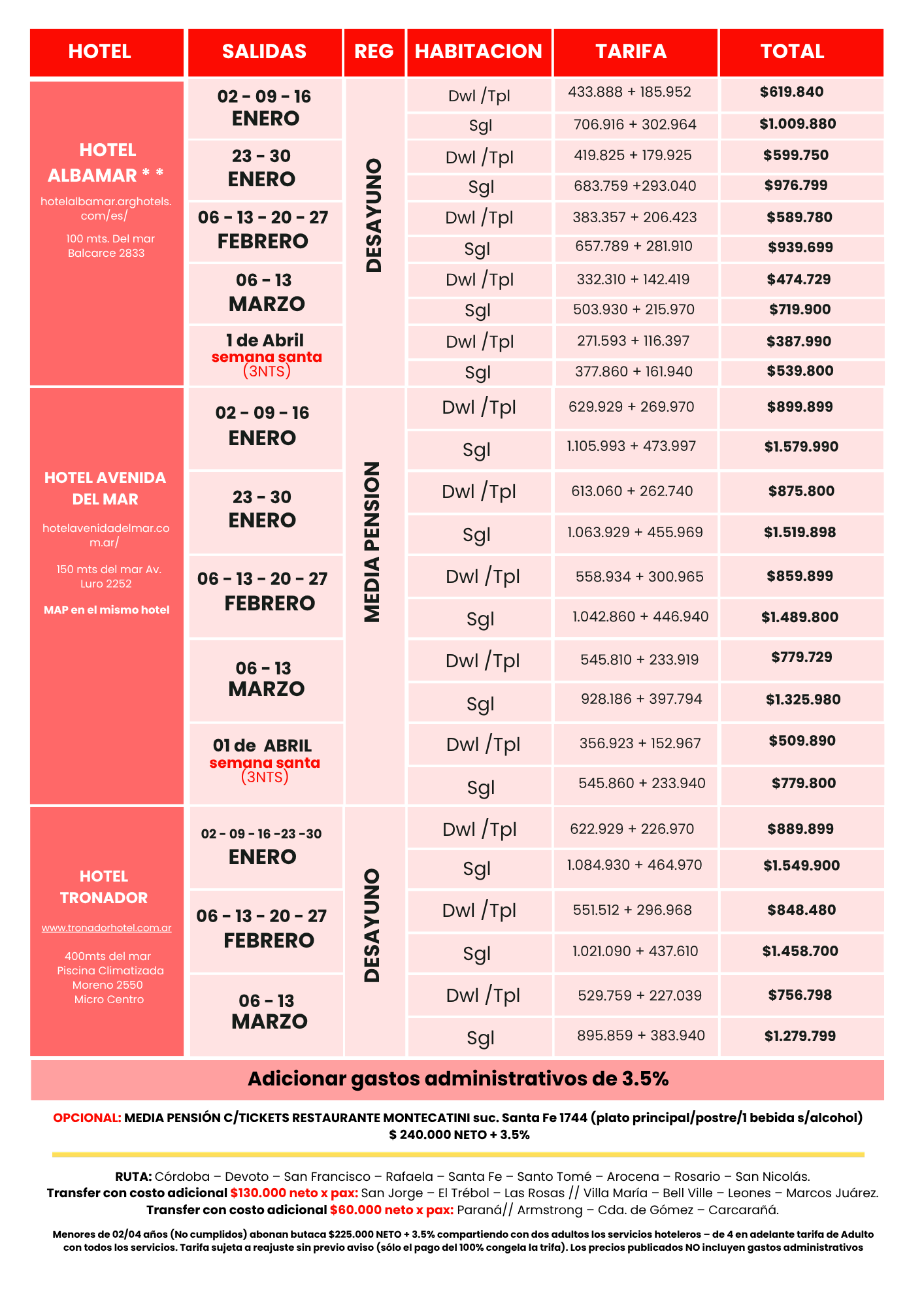 Mar del Plata 2026 Tarifario