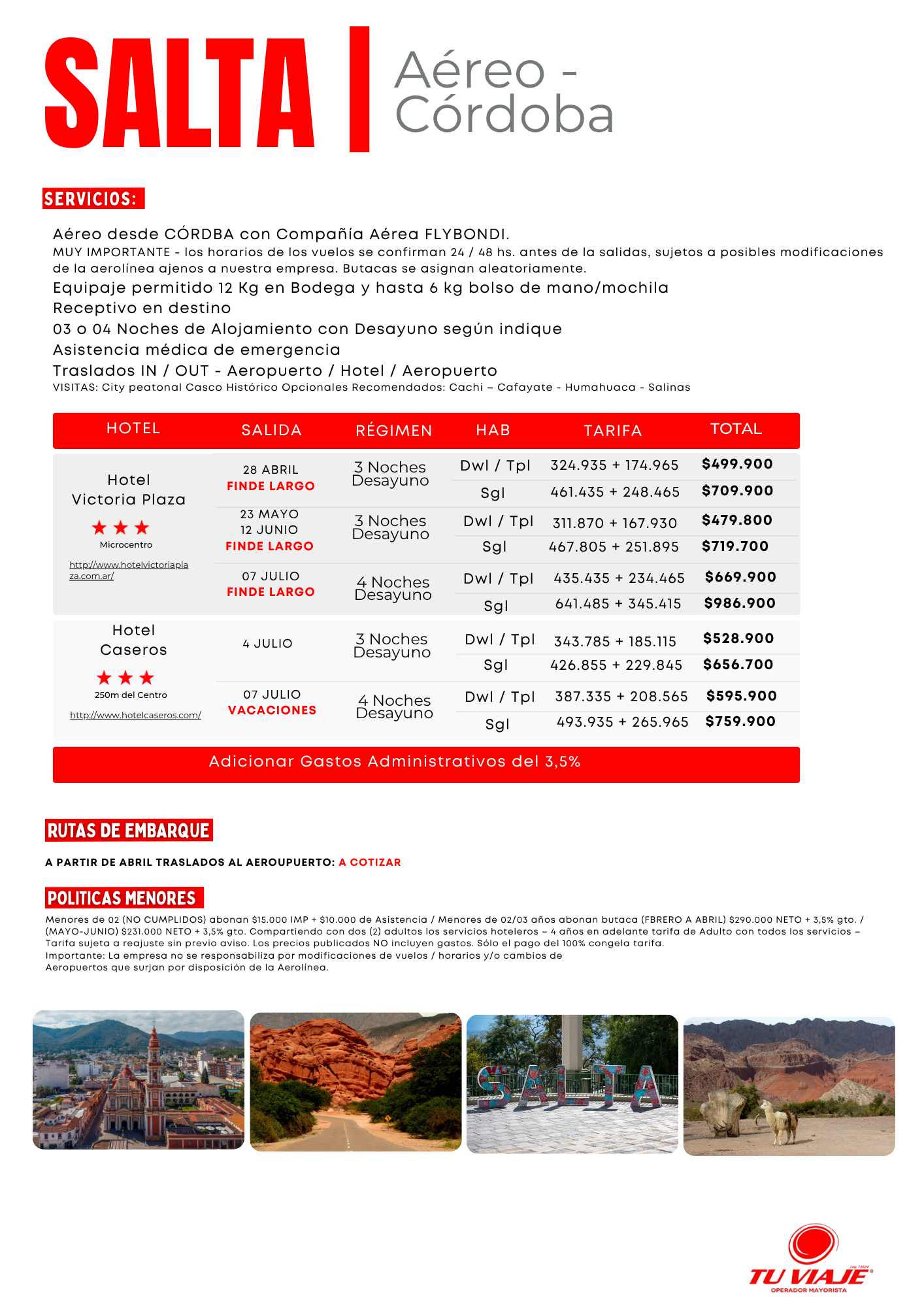 | locations | Bariloche – El Bolsón, Bariloche – El Bolsón, Argentina, Bariloche – El Bolsón, Argentina (aereo), Bariloche, Argentina, Bariloche, Argentina (aereo), Belen de Escobar, Argetina (bus), Brasil (bus), Buenos Aires, Argentina, Buenos Aires, Argentina (aereo), Camboriú – Brasil (bus), Camboriú, Brasil (aereo), Canasvieiras – Brasil (bus), Canasvieiras, Brasil (aéreo), Catamarca, Argentina, Catamarca, Argetina (bus), Catarastas del Iguazú, Brasil (bus), Cataratas del Iguazú, Argentina, Cataratas del Iguazú, Argentina (aereo), Cataratas del Iguazú, Argetina (aereo), Cataratas del Iguazú, Brasil, Cataratas Foz Iguazú, Brasil (bus), Cerro Copina, Argentina (bus), Cerro Uritorco, Argentina (bus), Córdoba, Argentina, El Calafate – Usuhaia, Argentina, El Calafate – Usuhaia, Argentina (aereo), El Calafate, Argentina, El Calafate, Argentino (aereo), El Calafate, Ushuaia -Argentina (aereo), El Calfate, Argentina (aereo), La Falda, Argentina (bus), La Rural de Palermo, Argentina (bus), La Rural Palermo, Argentina, La Rural Palermo, Argentina (bus), Laguna – Brasil (bus), Laguna Santa Catarina y Granado, Brasil (bus), Mar de Ajo Bs As , Argentina (bus), Mar de Plata, aereo, Mar de plata, Argentina (bus), Mendoza, Argentina, Mendoza, Argentina (aereo), Mendoza, Argentina (aéreo), Mendoza, Argetina (aereo), Merlo – San Luis, Argentina (aereo), Norte Argentino (aéreo), Norte Grande, Norte Grande, Argentina, Norte Grande, Argentina (aereo), Norte Grande, Argentino (bus), Pinamar, Argentina (bus), Salta, Argentina, Salta, Argentina (aereo), Talamapaya y Valle de la Luna, Argentina (bus), Talampaya y Valle de la Luna, Argentina, Temaiken – Parque de la Costa – Tigre, Argentina (bus), Temaiken – Parque de la Costa – Trigre, Argentina, Tierra del Fuego, Argentina, Trelew, Argentina, Trelew, Argentina (aereo), Villa Carlos Paz, Argentina (bus), Villa Carlos Paz, Cba., Villa Gesell, Argentina (bus) |